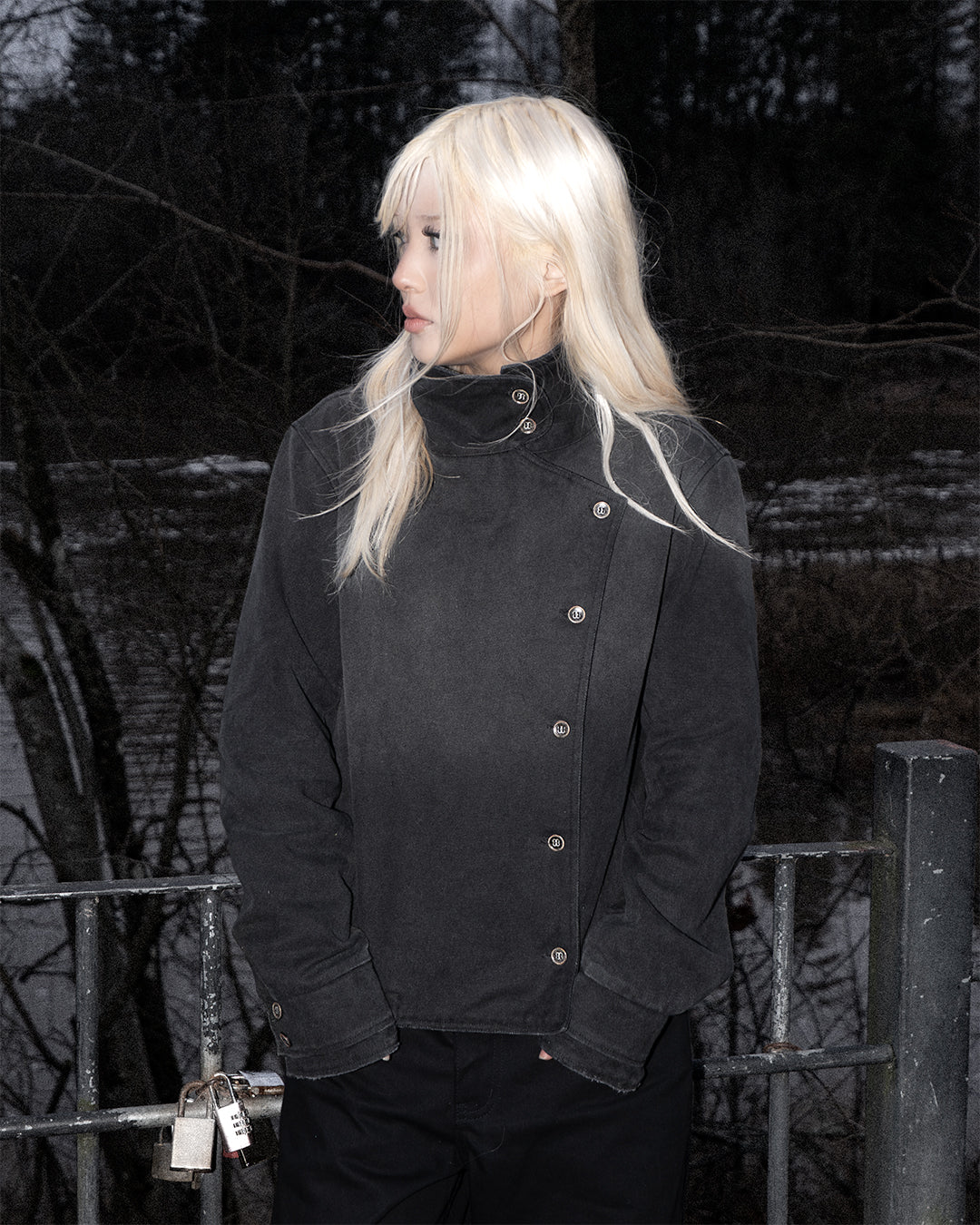 Dense fabric, asymmetrical cut, protective collar, and reinforced buttons for a durable and structured jacket.